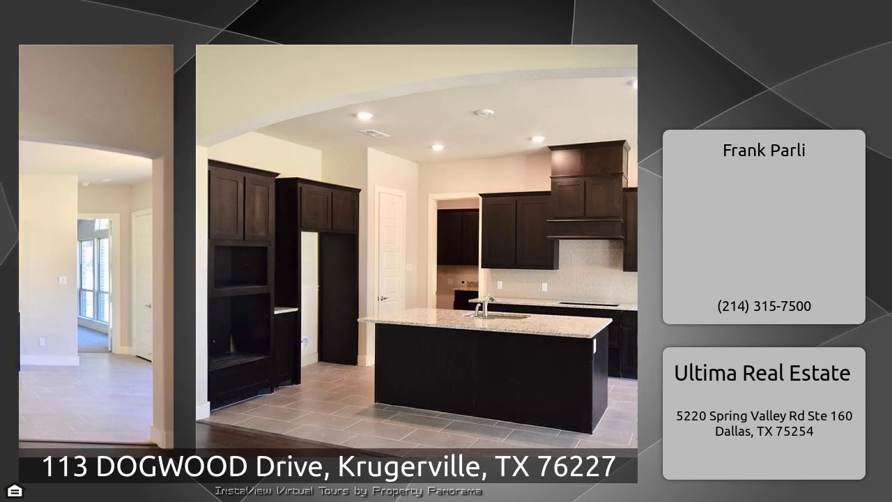 The Virtual Tour for the property at 113 DOGWOOD Drive, Krugerville, TX 76227 listed for $439,000: Other homes for sale by Frank Parli of Ultima Real Estate: $30K PRICE DROP! TREES TREES TREES!! BRAND NEW CUSTOM ONE STORY 4-3-3 CAR RESTING ON HEAVILY WOODED HALF-ACRE HOMESITE! Beautiful drive-up with gorgeous brick and stone.Fantastic layout features F. Dining with 12' ceiling, HUGE Study with French Doors, LARGE Family Room with 12' ceiling, LARGE Master with 12' ceiling and HUGE closet AND gorgeous views of trees, great Kitchen with Custom Cabinets and granite tops, 3 large bedrooms. …