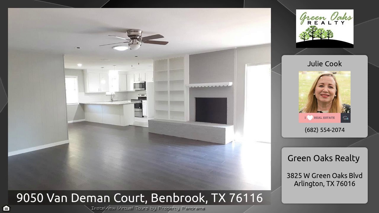 The Virtual Tour for the property at 9050 Van Deman Court, Benbrook, TX 76116 listed for $239,900: Other homes for sale by Julie Cook of Green Oaks Realty: Wonderfully remodeled home is established neighborhood. Light and neutral paint colors with all the latest options in lighting fixtures, hardware and flooring. Bonus area with french doors can be used for dining, office, second living area, or bedroom. Come enjoy an over sized lot and yard with plenty of mature trees and a very large driveway that can accommodate a boat, recreational vehicles or extra cars. Nice sized storage building. 3 …