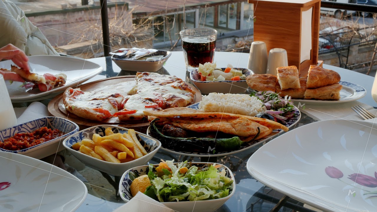 Female hand taking hot pizza on served dining table. Appetizing pizza, french fries, salad and snacks on delicious lunch table.