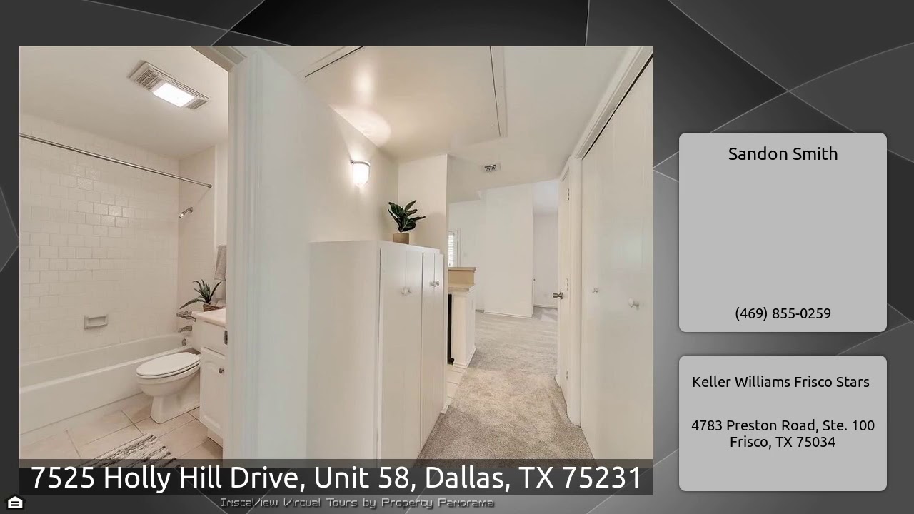 The Virtual Tour for the property at 7525 Holly Hill Drive, Unit 58, Dallas, TX 75231 listed for $1,250: Other homes for sale by Sandon Smith of Keller Williams Frisco Stars: Newly upgraded 2-2 large 2nd flr unit boasts dramatic vaulted ceilings & skylights in living area w remote ceiling fans. Built-in cabinets in living & hall areas allow ample storage. French doors from dining room open onto balcony. Kitchen complete w fridge, dishwasher, stovetop range & microwave. Laundry area fitted w full-size W&D. Luxurious neutral carpet in living,dining & BRs w floor tiles in entry, kitchen & …