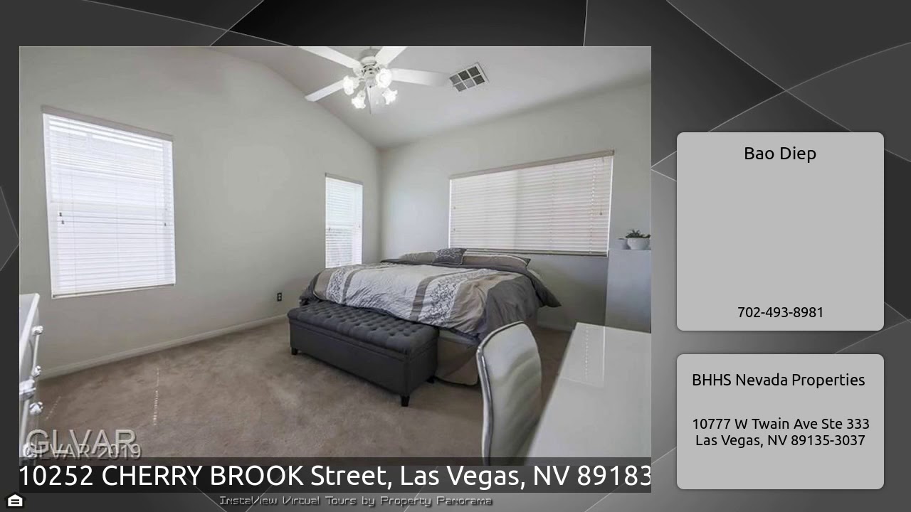 The Virtual Tour for the property at 10252 CHERRY BROOK Street, Las Vegas, NV 89183 listed for $290,000: Other homes for sale by Bao Diep of BHHS Nevada Properties: Hidden gem in the Silverado community! gated with community pool! Modern touch with upgraded flooring! Kitchen granite countertops and backsplash! Spacious open ceiling living room overlooked by upstairs loft with closet. Double french doors!!!! off formal dining room lead to backyard. This is a must see!