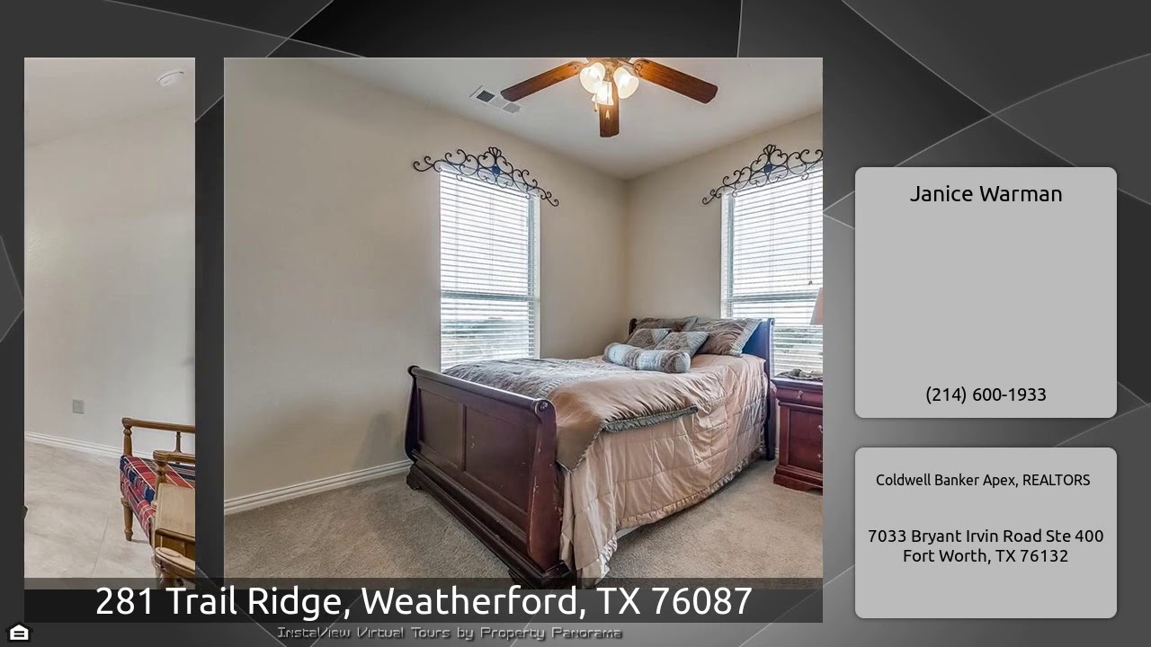The Virtual Tour for the property at 281 Trail Ridge, Weatherford, TX 76087 listed for $449,999: Other homes for sale by Janice Warman of Coldwell Banker Apex, REALTORS: PRICE REDUCTION. Beautiful family home with 6 bedrooms and 4.1 bathrooms. The curb appeal will take your breath away. You are greeted with a front porch to take in the panoramic views. The soaring ceiling inside await you as you enter the home with a study with french doors and a dining room. The family room is open to the spacious custom kitchen with breakfast bar, granite counters, & walk in pantry. The laundry room with …