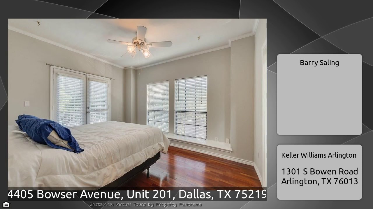 The Virtual Tour for the property at 4405 Bowser Avenue, Unit 201, Dallas, TX 75219 listed for $260,000: Other homes for sale by Barry Saling of Keller Williams Arlington: A RARE OPPORTUNITY just opened, and this light and bright condo is now available and ready for a new owner. The home, situated on a corner lot, features a fireplace in the living room, windows all around for a bright, airy feel; French doors off the master bedroom and dining room; two bedrooms, each with its own bath and walk-in closet; and a large patio that is perfect for entertaining, morning coffee, or evening …