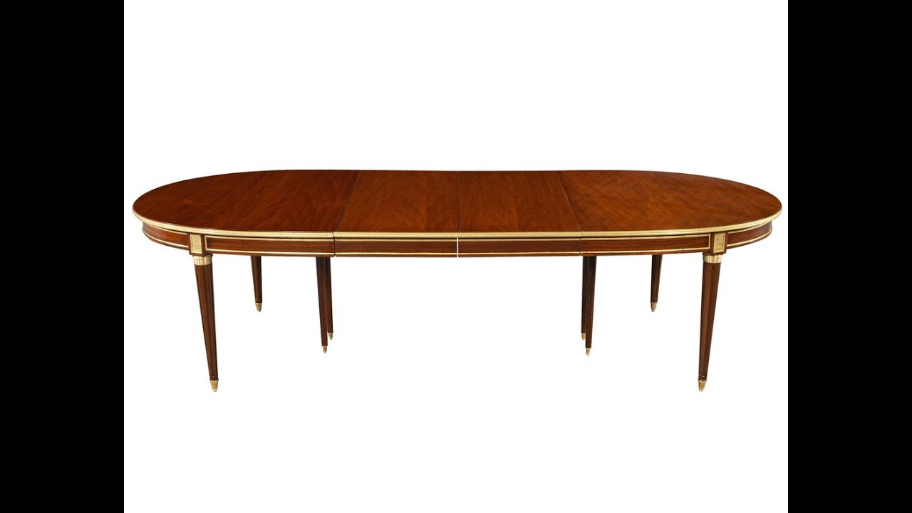Original French 1940’s Maison Jansen Dining Table Polished Mahogany with Brass Detailing. France, circa 1940’s, all original. Featuring French polished mahogany colored finish with all original brass ornaments. Table features 2 leaves with hideaway dropdown legs to support the extensions. Magnificent attention to detail with Louis XVI influenced style.