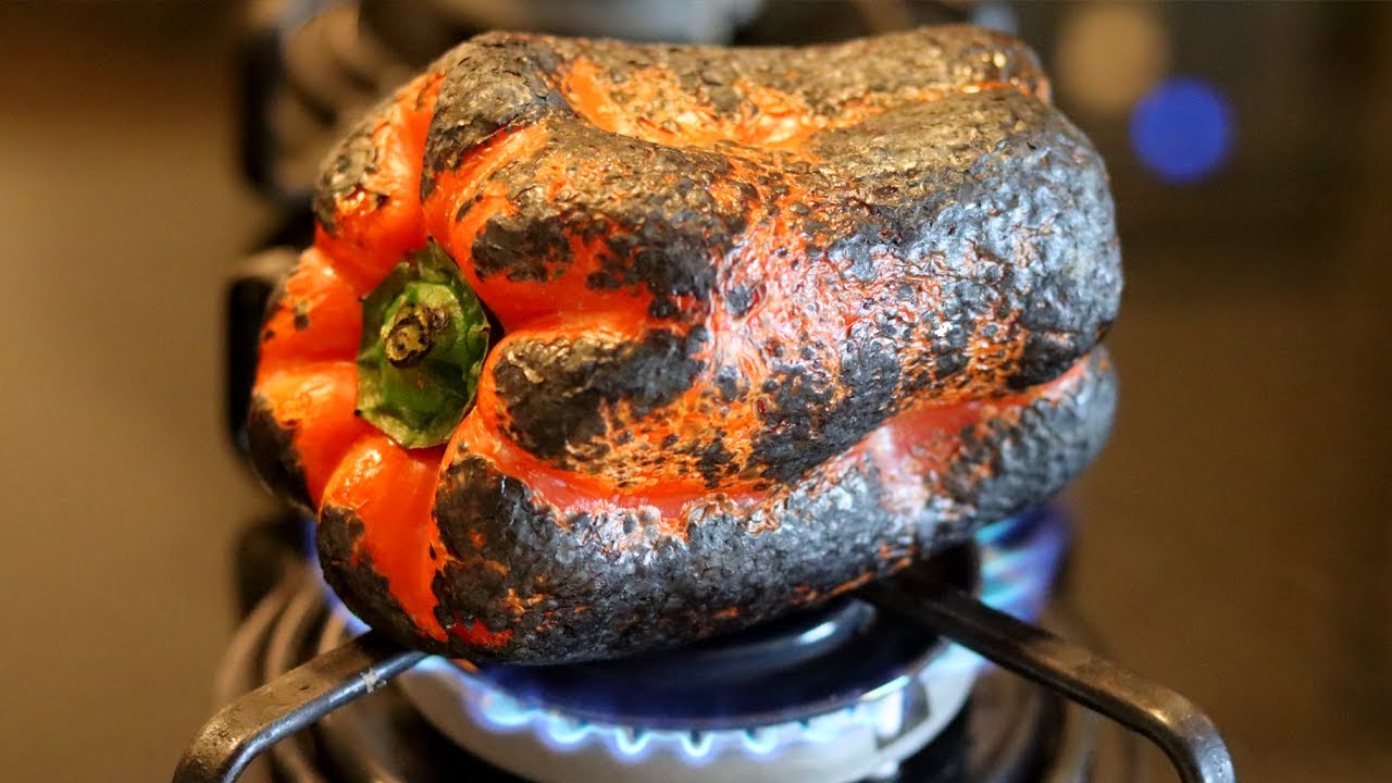 Asse os pimentões diretamente na chama de um fogão a gás ou em uma grelha sobre carvão bem quente, virando com frequência, até que as peles estejam carbonizadas.