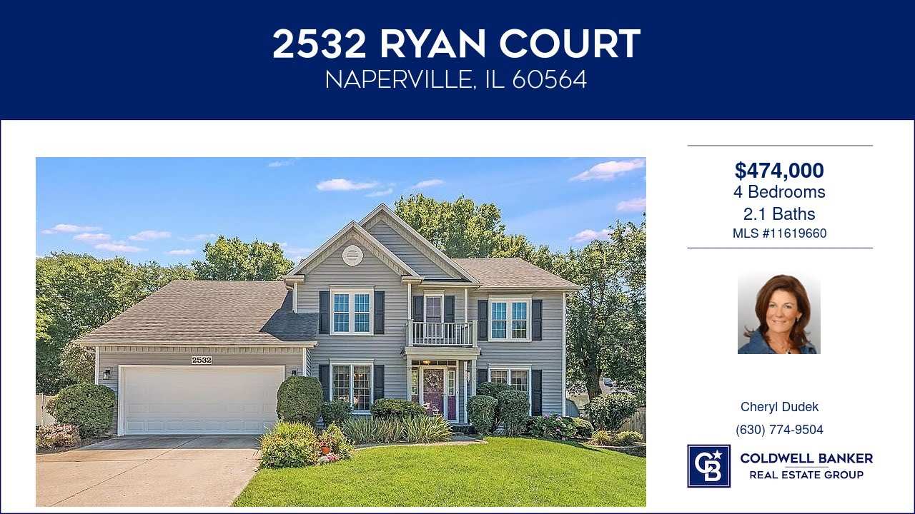 2532 Ryan Court Naperville Illinois Homes for Sale | www.coldwellhomes.com | Cheryl Dudek with Coldwell Banker Real Estate Group | See full property details at | Multiple offers, please submit highest/best by Monday 9/5 noon. OUTSTANDING HOME ON PRIVATE CUL-DE-SAC! 4 BEDROOMS, PLUS 1ST FLOOR DEN/OFFICE AND FINISHED BASEMENT! JUST BLOCKS TO ELEMENTARY & MIDDLE SCHOOL! GOURMET KITCHEN WITH CENTER ISLAND AND BUTLER PANTRY! FORMAL LIVING AND SEPARATE DINING ROOM! VAULTED FAMILY WITH CENTER FIREPLACE! 1ST FLOOR DEN WITH DOUBLE FRENCH DOOR ENTRY! 1ST FLOOR LAUNDRY! LUXURY VAULTED MASTER SUITE, MASTER BATH WITH WHIRLPOOL AND SEPARATE SHOWER! 3 ADDITIONAL SPACIOUS BEDROOM! FINISHED BASEMENT WITH FAMILY ROOM AND PLAYROOM, PLENTY OF STORAGE! AWESOME REAR DECK OVERLOOKING PARK-LIKE BACKYARD! UPDATES THROUGHOUT INCLUDE, ROOF & SIDING 2012, A/C 2021, FURNACE 2012, HUMIDIFIER 2018, WATER HEATER 2017, STAINLESS STOVE/OVEN & REFRIG 2016, REFINISHED HARDWOOD FLOORS 2018. FOR THE OUTDOOR ENTHUSIASTS, BIKE, WALK, RUN THE SPRINGBROOK PRAIRIE PATH JUST 3 BLOCKS AWAY! ELEMENTARY, MIDDLE SCHOOL JUST BLOCK AWAY! AWARD WINNING NEUQUA HIGH SCHOOL , LIBRAY, AND SHOPPING WITHIN 1 MILE! HOME HAS A SECURITY SYSTEM AND SPRINKLER SYSTEM, BOTH BEING CONVEYED AS-IS, SELLER HAS NOT USED THOSE FOR A FEW YEARS.