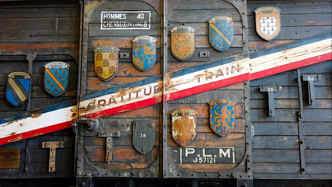 After WW2, the United States sponsored a Friendship Train collecting food and supplies for the war-stricken people of France. Each car filled with a variety of gifts, such as French wine, family heirlooms, and art. In 1949, the French said “thank you” with the Gratitude or “Merci Train” displaying the coat of arms of French provinces and the “Merci Train” symbol. The flowers symbolized Flanders Field where many American soldiers were buried.