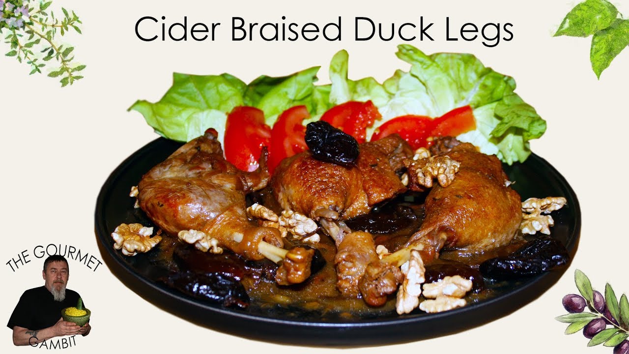 8 duck legs (young duck), 4 bay leaves, 1 bunch fresh thyme, ½ tbsp coarse sea salt, 1 tsp black peppercorns, 6 cardamom pods, 400gr prunes, 125gr walnuts, 1 liter hard cider, 1 tbsp wheat flour, salt and pepper to adjust at the end.