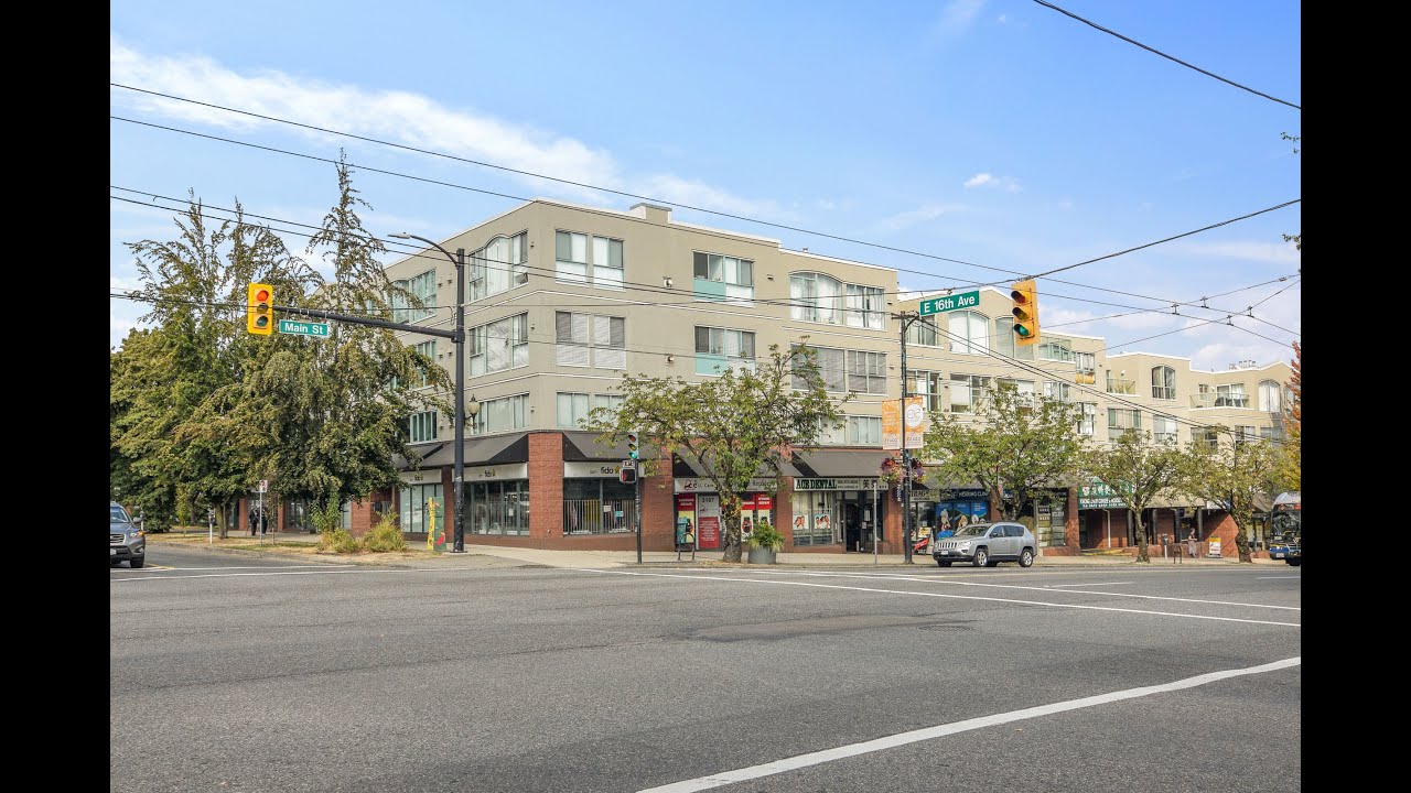 Excellent value in this clean 1 BR & Den unit in Cartier Place! This east-facing suite features double-glazed windows, gas fireplace, laminate floors, a spacious open plan Living Room / Dining Room & in-suite laundry. The Kitchen comes with a big pass-thru to the Dining Room, as well as stainless steel appliances, & tiled floor. Linen closet in the Bathroom. Large rectangular Bedroom (911″ x 162″), with French doors accessing the Den. Freshly painted. All this in a fully rainscreened building at East 16th & Main! Upper Mount Pleasant offers tremendous amenities from coffee shops to restaurants, plus Save On Foods & a full range of shopping options at Centrepoint Mall. Steps to Mt. Pleasant Park. #3 Main Street bus to Downtown, Expo Line ALRT Station, & soon, the new Broadway Line!