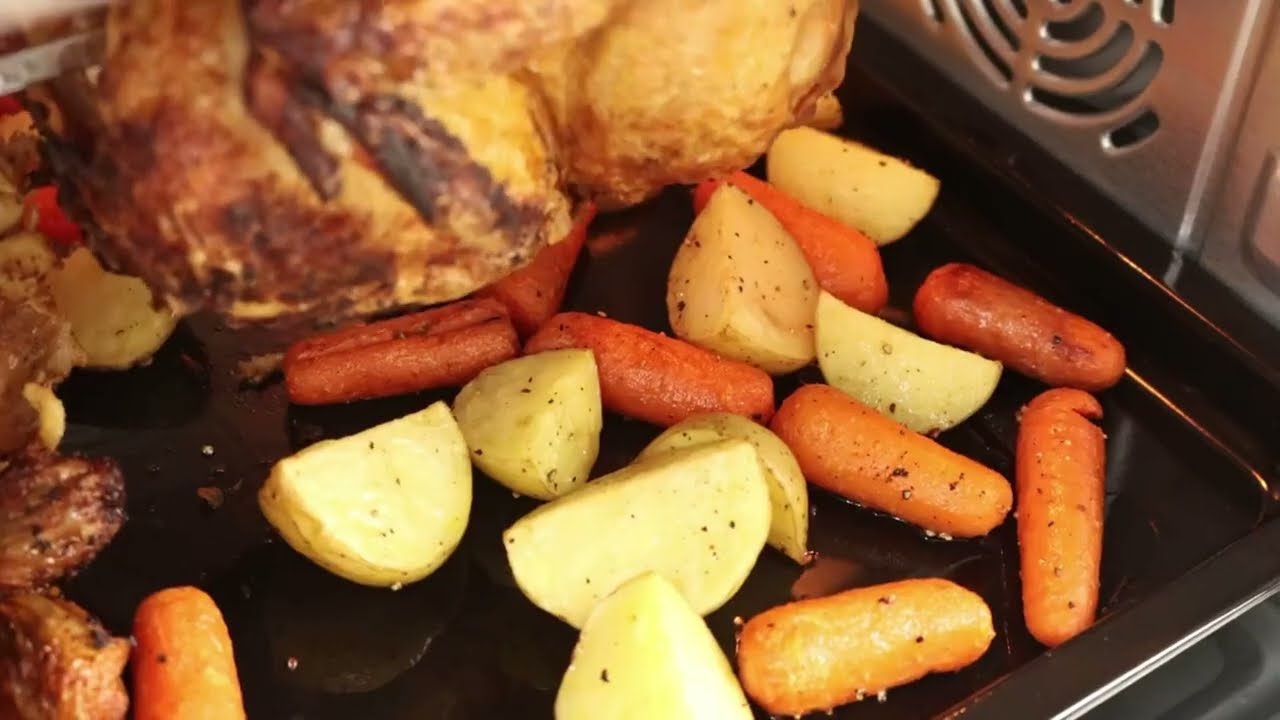 Convection feature circulates hot air inside the oven for flakier crusts, deeper flavors and more tender meats, in less time. Rotisserie spit & Fork assembly rotates food inside the oven while roasting it to perfection.