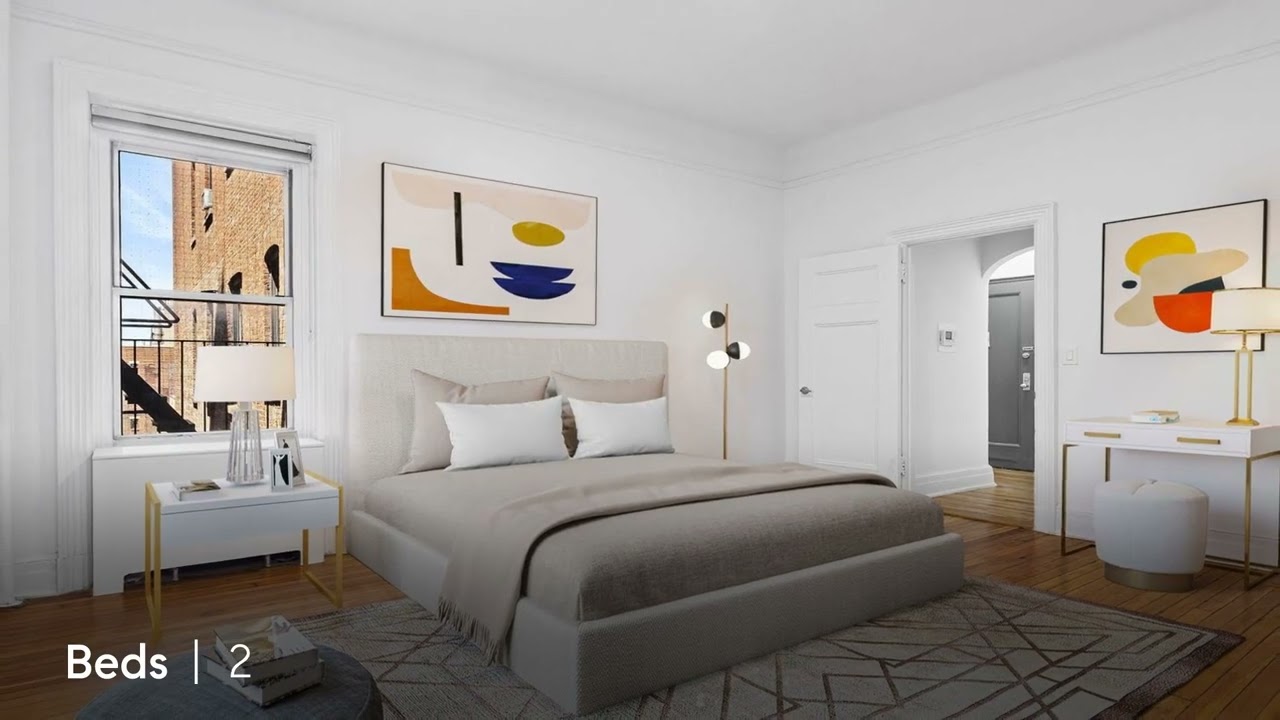 This stunning two bedroom home, drenched in light that floods from oversized Eastern facing windows, was recently gut renovated. The generous entry foyer is large enough to accommodate a gracious dining area or mud room and includes a walk-in closet. Fit for entertaining, the windowed chef’s kitchen opens into the expansive living room and features counter seating, quartz countertops, custom-built wood cabinetry and brand new stainless steel appliances including a dishwasher and gas range. The primary bedroom is large enough to accommodate a king size bed set and offers two deep closets and Western exposure. Down the hall, the secondary bedroom is also generously proportioned with abundant closet space. The windowed bathroom boasts a full sized washer/dryer housed in its very own laundry closet and brand new subway tiling. Original oak flooring, soaring 10 foot ceilings, arched doorways and crown molding maintain the pre-war charm of this freshly updated home. PHOTOS HAVE BEEN VIRTUALLY STAGED.