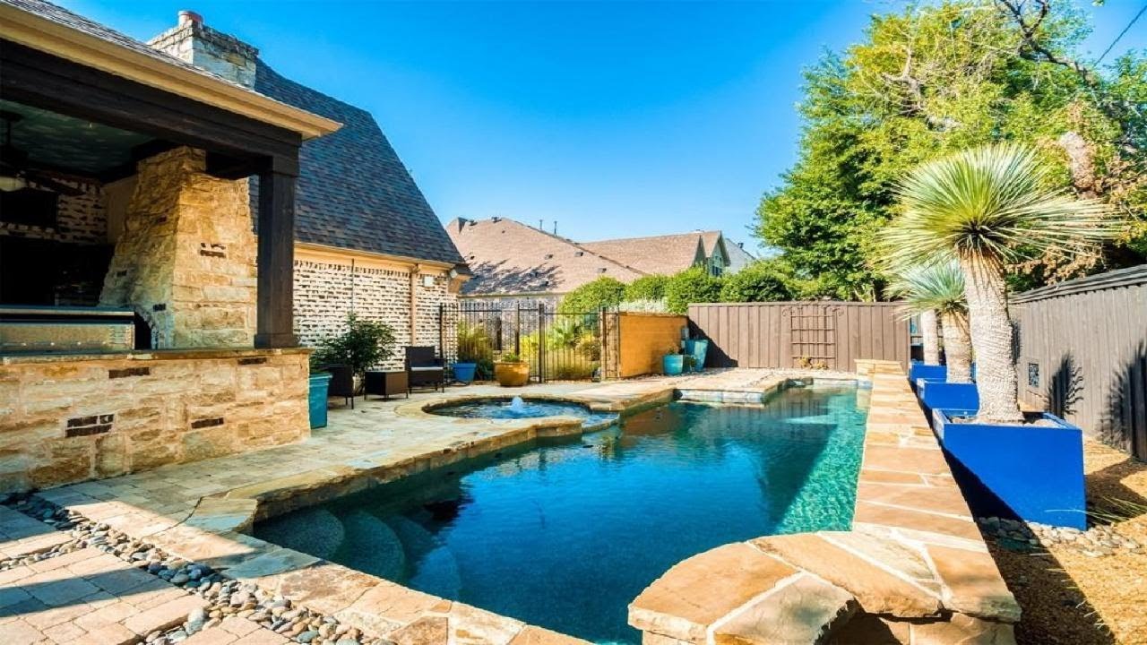 AMAZING! FULLY FURNISHED. English Tudor Style. Private Side Yard with Pool & Spa. Outdoor Kitchen, Covered Patio, Grill, TV, Fireplace + Yard. Bright & Open & airy with 12 foot ceilings, Luxury finishes, Tile Floors, tall baseboards, Crown Molding, Hardwood floors, skylights. Guest bedroom with 2nd full bath has a Roman Shower. 3rd Bedroom-Study-French Doors. Gourmet Island Kitchen, Gas Cooktop, Pantry, Built-In Refrigerator, Breakfast Bar,Pot Rack, opens to Big dining Area. 3 Skylights! Family Room off Kitchen-Dining, lighted Art knitch, TV-whole house wired for sound with Blt-In speakers, Gas-Logs fireplaces, Plantation Shutters. Big Master Suite, Cathedral Ceilings, Wood Floors, Window Seat, Walk-In Closet.