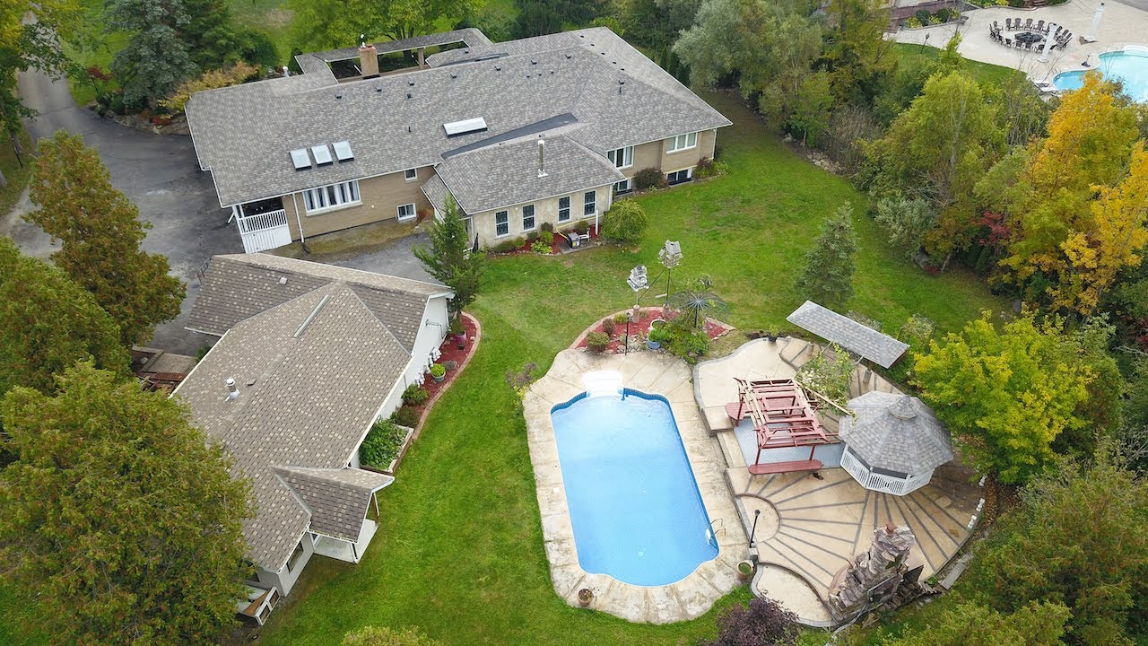 The multi-level sunroom has wood-panelled finishes; a wood wet bar and vinyl plank flooring on its upper tier; while its ground level has ceramic flooring, a walk-out to access the backyard, leaded glass windows, a wood stove, and a hot tub.