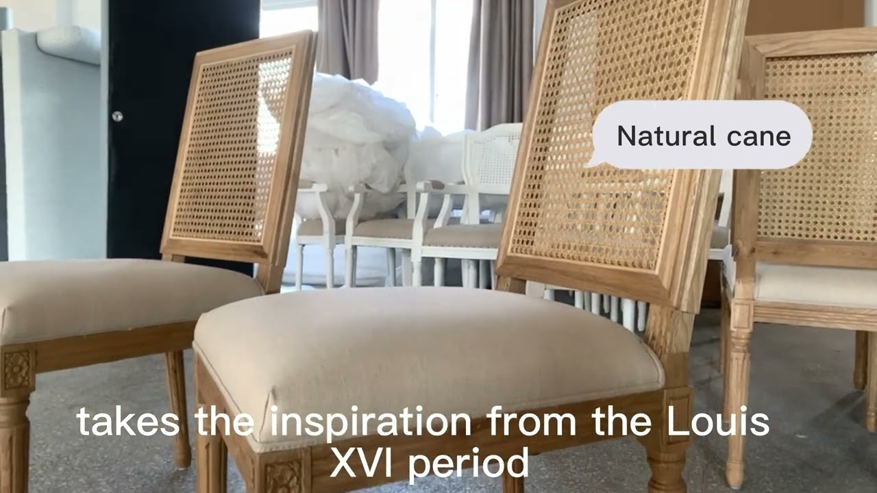 This chair are widely used in wedding, parties with their traditional chic look, can complete your French Provincial dining room with our dining tables. This Cane Back Linen Dining Chairs takes the inspiration from the Louis XVI period, feature a solid oak frame with tapered fluted legs, delicate carving and scroll work and a rattan back. They are upholstered in natural pure linen with a double piped trim.