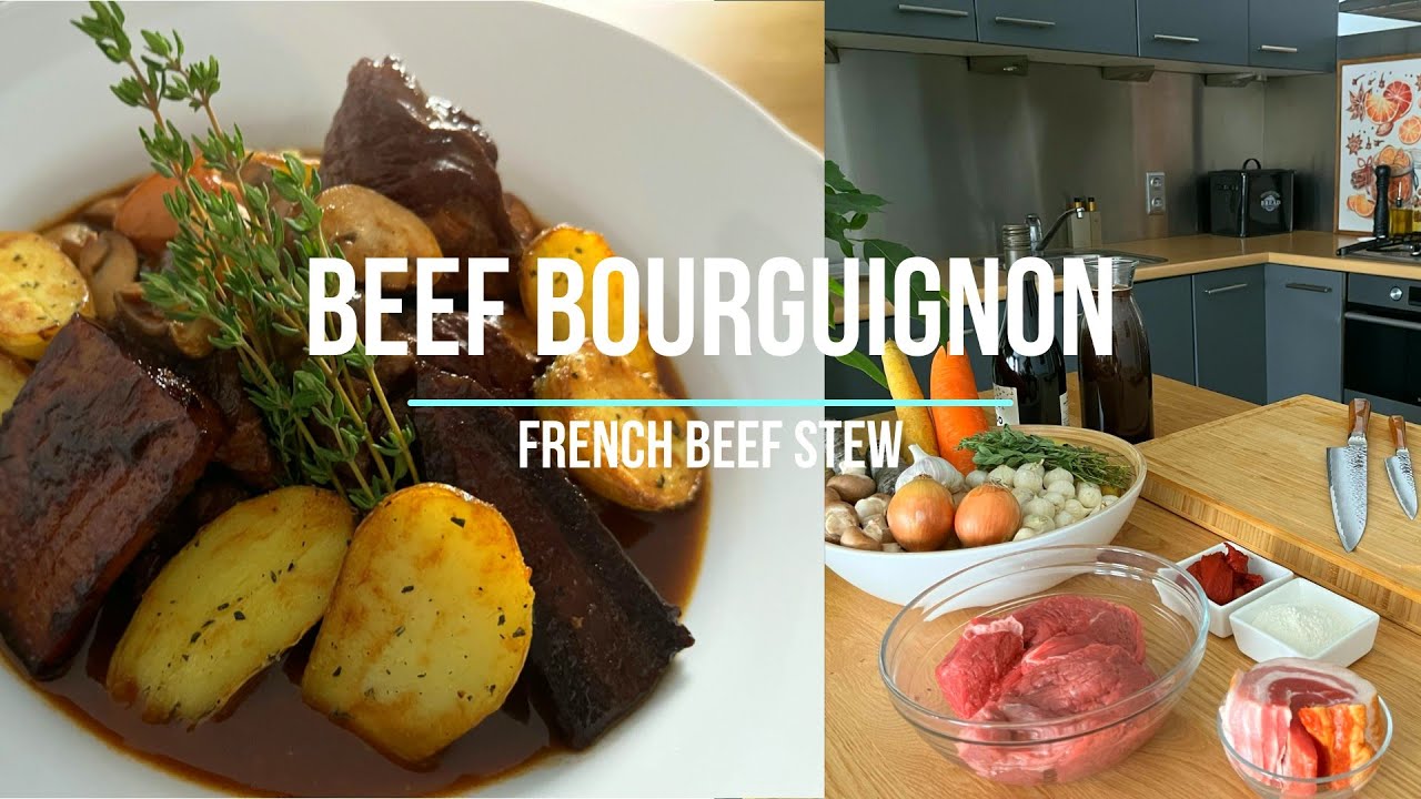What is better than a traditional French dish of braised beef in a red wine and veal stock sauce, with mushrooms, onions, and bacon? Garnished with roasted potatoes and caramelized carrots! Sounds delicious!