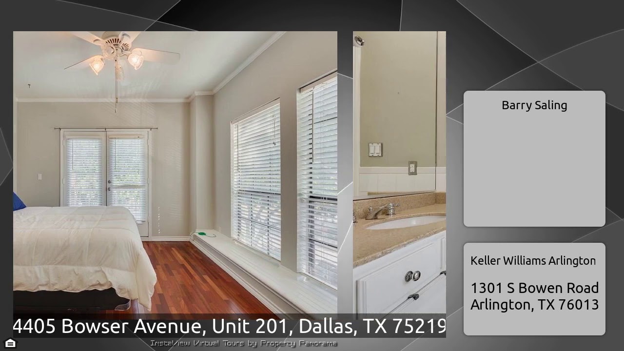 The Virtual Tour for the property at 4405 Bowser Avenue, Unit 201, Dallas, TX 75219 listed for $260,000: Other homes for sale by Barry Saling of Keller Williams Arlington: A RARE OPPORTUNITY just opened, and this light and bright condo is now available and ready for a new owner. The home, situated on a corner lot, features a fireplace in the living room, windows all around for a bright, airy feel; French doors off the master bedroom and dining room; two bedrooms, each with its own bath and walk-in closet; and a large patio that is perfect for entertaining, morning coffee, or evening …