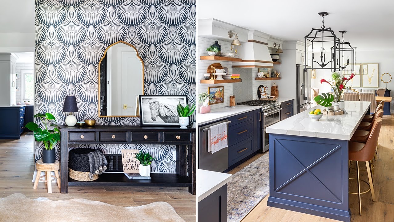 In this must-see before and after, designer Laurie Blyskis takes you behind-the-scenes of her dramatic home renovation. See how she overhauled the traditional abode into a modern farmhouse with touches of natural wood, brushed brass hardware and vintage elements. For a grand first impression, Laurie added lotus wallpaper to the entryway, and continued the drama into the open-concept living room and kitchen with navy lower cabinets, black French-style lanterns and a spacious island, perfect for holiday hosting. Plus, you’ll love how Laurie decorates for Christmas with plenty of fresh greenery, pops of blush and cream and a dash of festive sparkle.