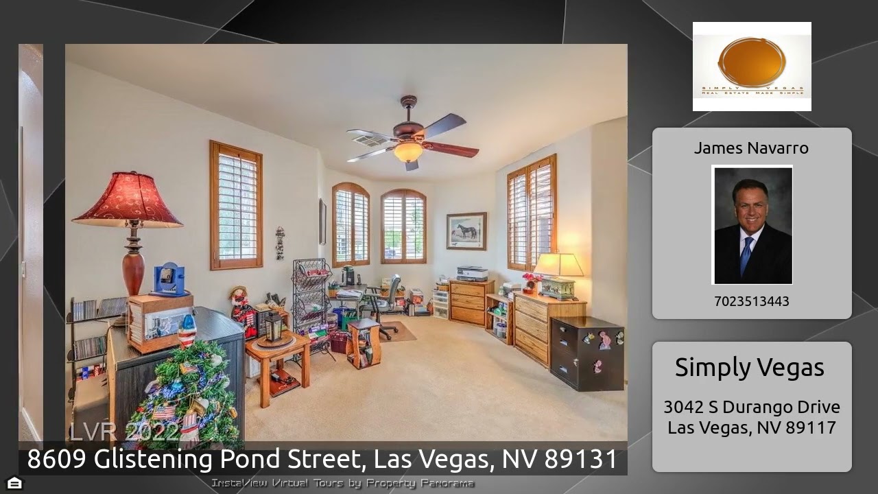 The Virtual Tour for the property at 8609 Glistening Pond Street, Las Vegas, NV 89131 listed for $715,000: Other homes for sale by James Navarro of Simply Vegas: This incredible 1 story, 4 bedroom , den and separate entry Casita with a full bath in the gated Whisper Creek community. This home is impeccable and well maintained .Gourmet granite kitchen island with a built-in wine rack & bookshelf, beautiful granite backsplash, new Reverse osmosis system, lots of cabinets, double oven, plantation shutters throughout the home. Master has two walk-ins closet, French doors leading to the pool, double …