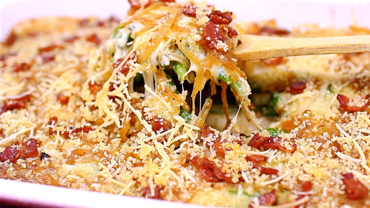 Make this Delicious french onion green bean casserole for thanksgiving, for it is Oh So Good! The green beans are deliciously baked with french onions, gourmet cheese and bacon. This green bean casserole is packed with delicious flavors.