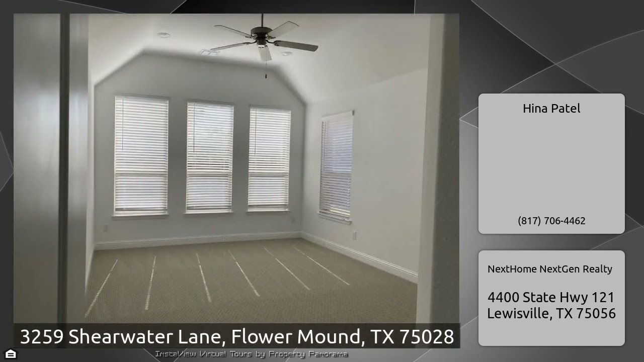 The Virtual Tour for the property at 3259 Shearwater Lane, Flower Mound, TX 75028 listed for $3,780: Other homes for sale by Hina Patel of NextHome NextGen Realty: Gorgeous 2022 brand new deluxe house in the highly sought-after Bradford Park in Flower Mound. First floor features a soaring 2-story foyer, spacious family room, gourmet kitchen, a primary bedroom, a study with French doors, a guest bedroom, and a 3-car garage. Second floor features a game room with a powder room, a family theater, and 2 bedrooms with ceiling fans sharing a jack-and-jill bathroom with separate vanities. The …