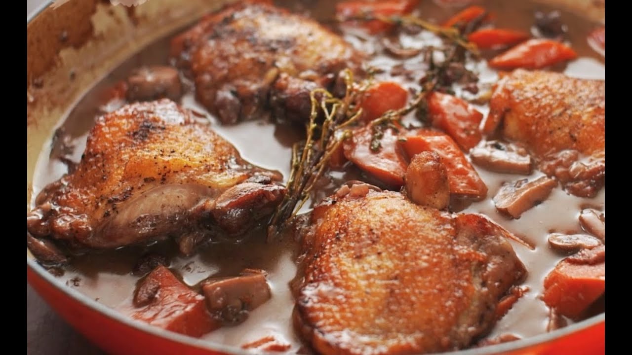 Add the carrots and onions to the pan and cook over medium heat for about 10 minutes or until the onions are lightly browned. Add the garlic and mushrooms and cook for 1 minute. Add the wine to deglaze all the crispy brown bits stuck to the bottom of the pan. Then add the chicken stock, thyme, bacon, chicken, and any juices that collected on the plate into the pot. Season with salt and pepper and bring to a simmer.