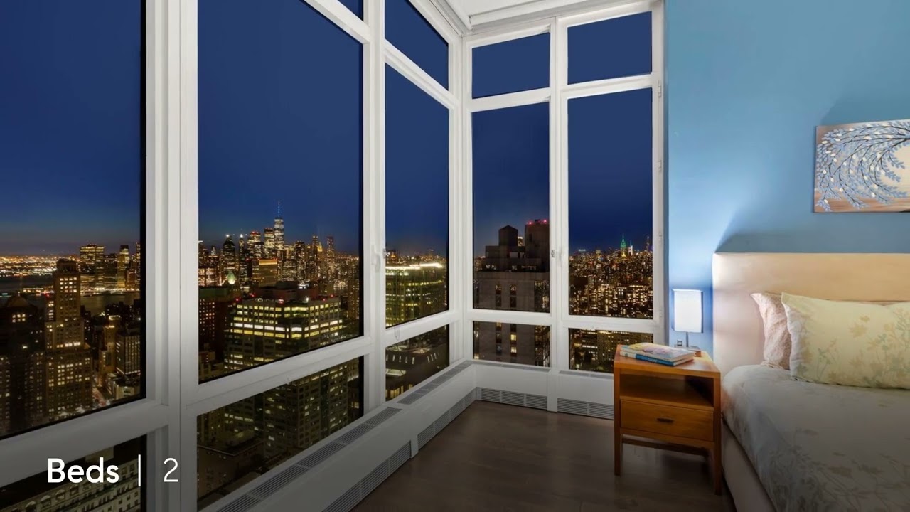The spacious primary bedroom with walk-in closet boasts postcard views of Downtown and Midtown Manhattan through walls of floor to ceiling windows. The luxurious en-suite bathroom with walk-in shower premieres glistening white quartz walls, Lagos Azul limestone floors and shower walls. The second bedroom offers the perfect space for an office or a baby nursery with unmatched views of Manhattan and the NY harbor. The adjacent second bathroom offers a large soaking tub, a white quartz sink and a large vanity.