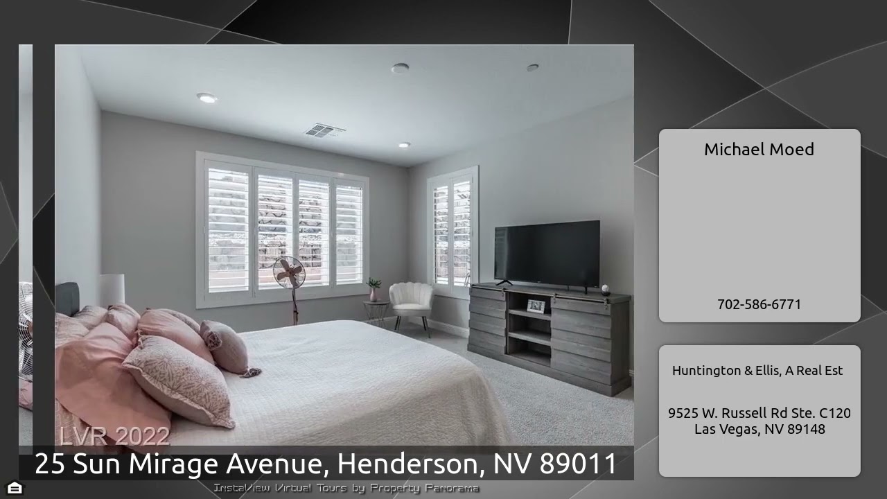 The Virtual Tour for the property at 25 Sun Mirage Avenue, Henderson, NV 89011 listed for $599,999: Other homes for sale by Michael Moed of Huntington & Ellis, A Real Est: Lifestyle meets modern luxury in this barely-lived in widely-popular Silver Creek floor plan. Light, bright, crisp and clean! Tall ceilings, 8 foot doors and large picture windows spill in natural light. Custom gourmet Kitchen features double-stacked flawless white cabinets, Stainless appliances and stunning backsplash. Enter glass French doors into your private and spacious Den. Primary suite enjoys a large upgraded shower …