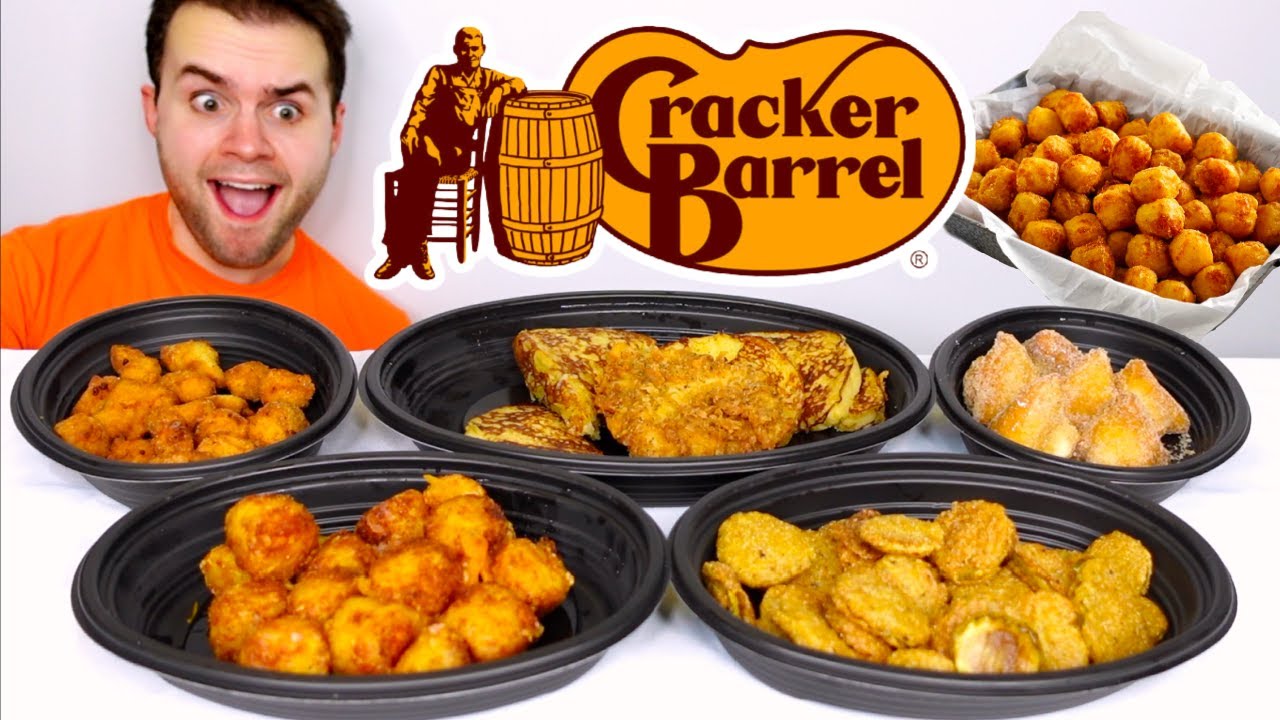 so cracker barrel released 8 new items onto the menu and I was gonna taste test all of them but 3 weren’t available so I could only review 5 of them including the new country fried pickles, white cheddar cheese bites, and the Loaded Hashbrown Casserole Tots! I also tried the Biscuit Beignets and the new meal which is called Sunday Homestyle Chicken n’ French Toast! do you plan on trying Cracker Barrel’s new menu items!? please let me know in the comments which NEW restaurant items you want me to try!
