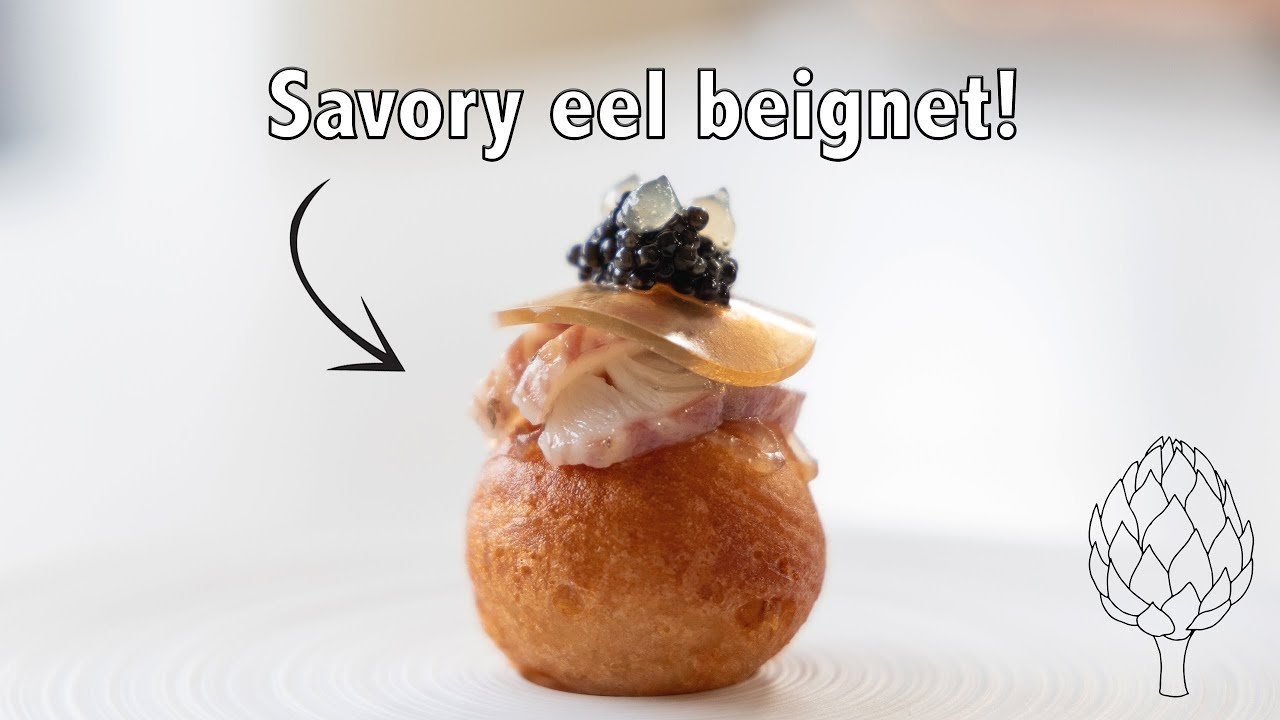 Hey guys! Today we’re going to make a smoked eel beignet, for that first I’m going to show you how to clean an eel. Then we’re going to use the bones to make an eel broth and turn that into a delicious eel jelly and the beignet batter. The hot beignet we’re serving with thinly sliced eel, a citrus gel and some caviar. All great recipes, so enjoy guys!