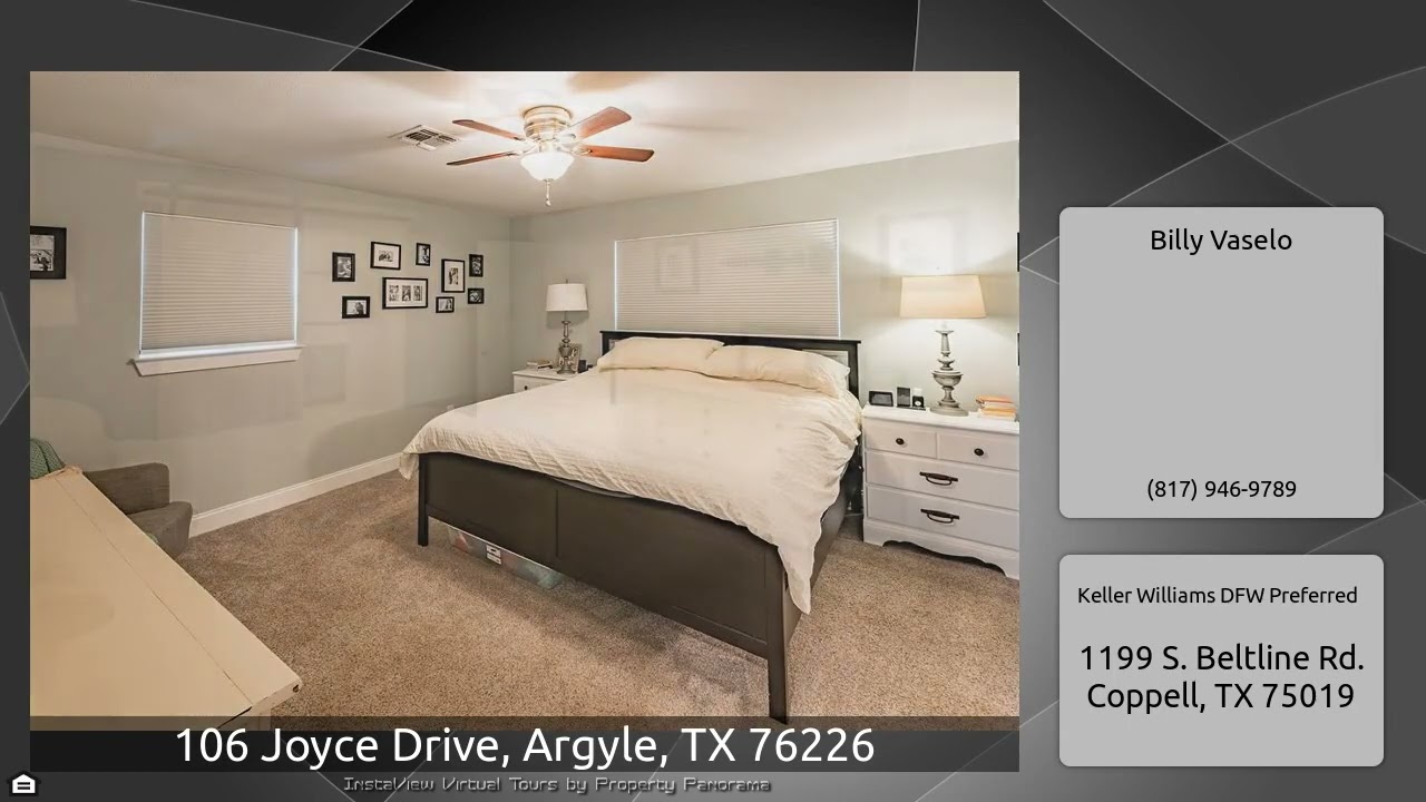 The Virtual Tour for the property at 106 Joyce Drive, Argyle, TX 76226 listed for $650,000: Other homes for sale by Billy Vaselo of Keller Williams DFW Preferred: Large lot in a cul-de-sac with beautiful mature trees. Just over half an acre with 2 car garage and a mother-in-law cottage. Home has a very open floor plan with a beautiful fireplace, split bedrooms, gourmet kitchen, 6 burner gas stove, large kitchen island, plumbed for ice maker, granite countertops. Beautiful French doors open up to the large, entertaining patio in the very inviting backyard. Master suite includes a large walk- …