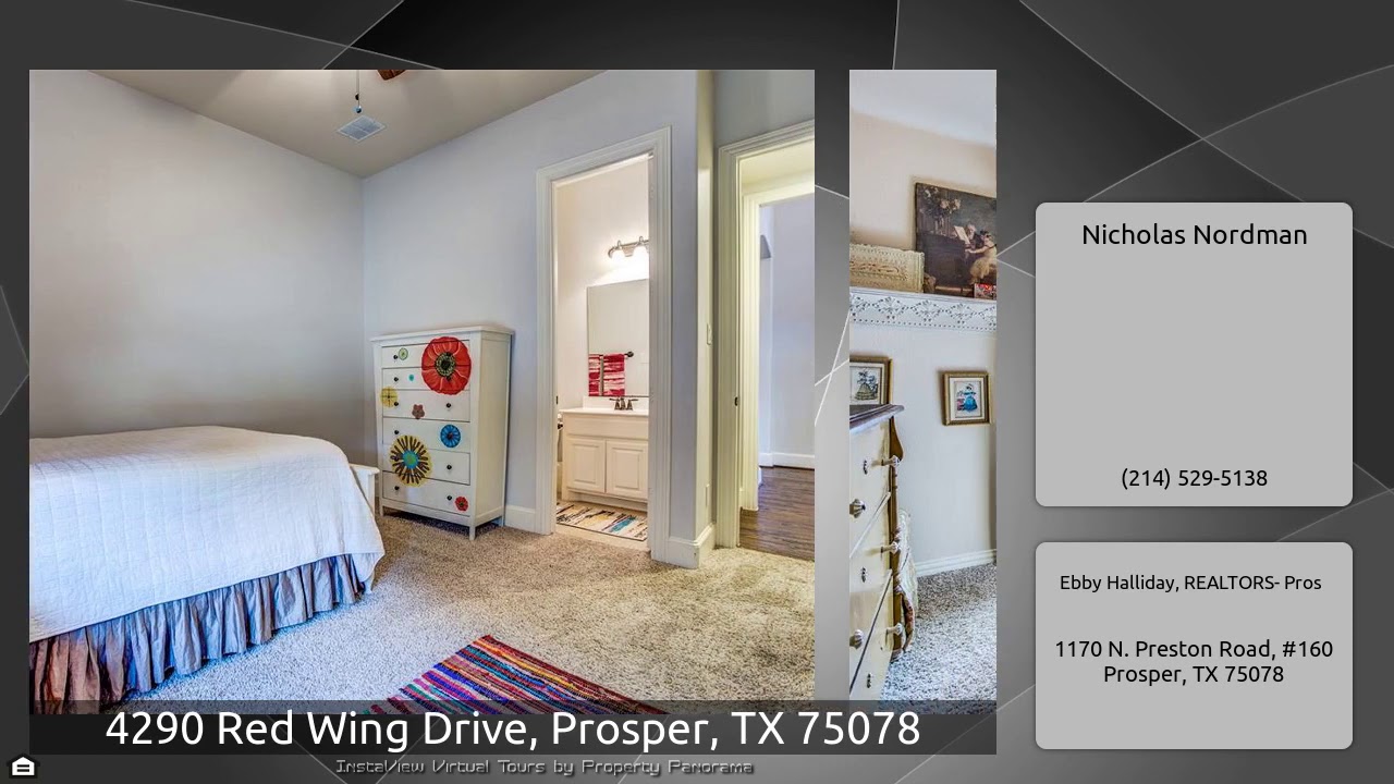 The Virtual Tour for the property at 4290 Red Wing Drive, Prosper, TX 75078 listed for $489,900: Other homes for sale by Nicholas Nordman of Ebby Halliday, REALTORS- Pros: Stunning one and a half story in Whitley Place with handscraped wood floors, fresh paint and more! The covered front porch leads to an oversized entryway with a study with french doors to the left and the formal dining room to the right, perfect for entertaining. The chef's kitchen features striking granite counters, stainless appliances, an island, gas cooktop and built-in desk area. The spacious family room comes …