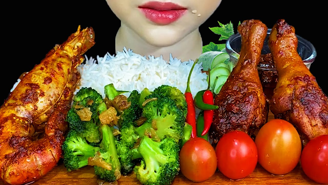 MUKBANG EATING||Spicy Prawn Curry & Chicken legs Curry & Fried Broccoli With Garlic