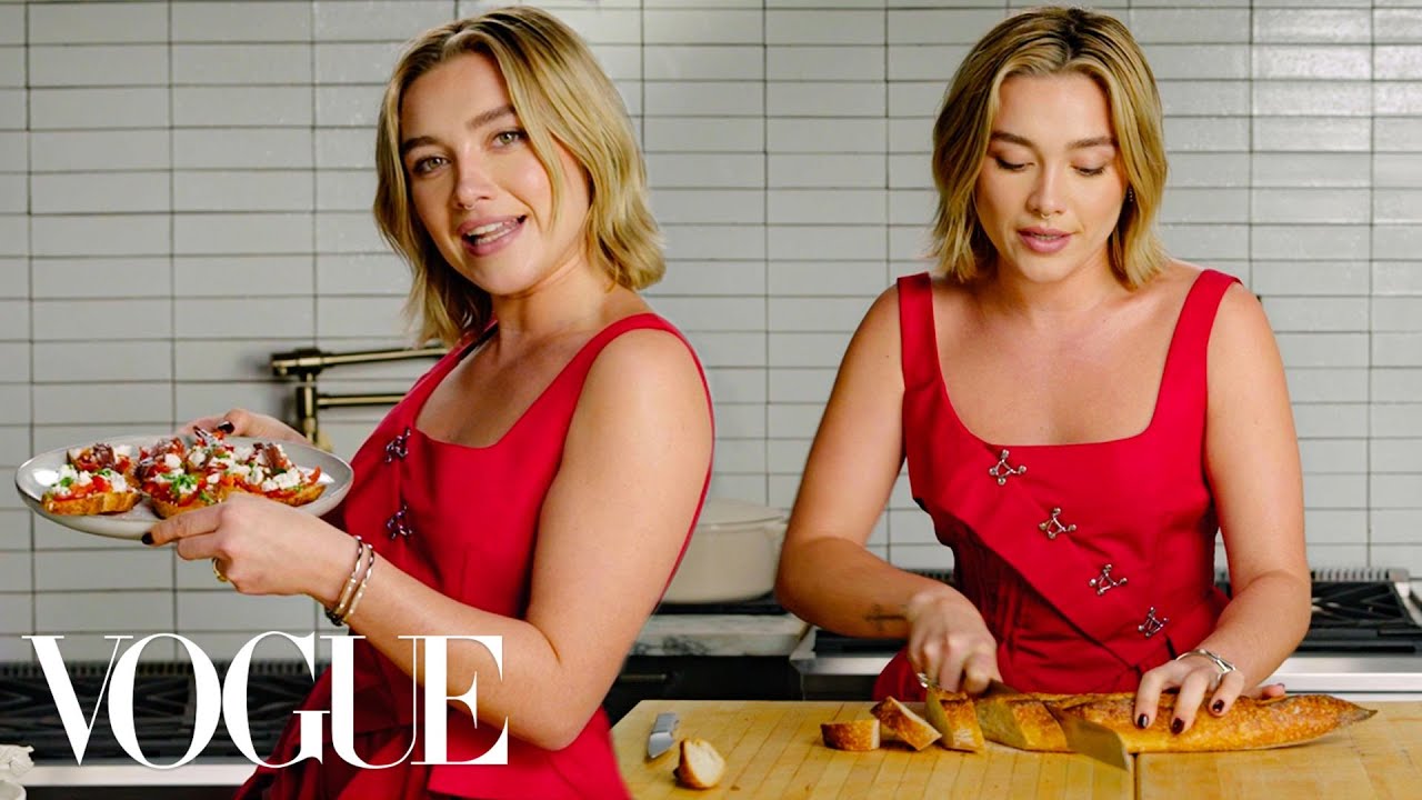 Actor Florence Pugh, whose father is a chef, shows off her cooking skills while making a (very) garlicky bread topped with tomatoes, feta and anchovies.
