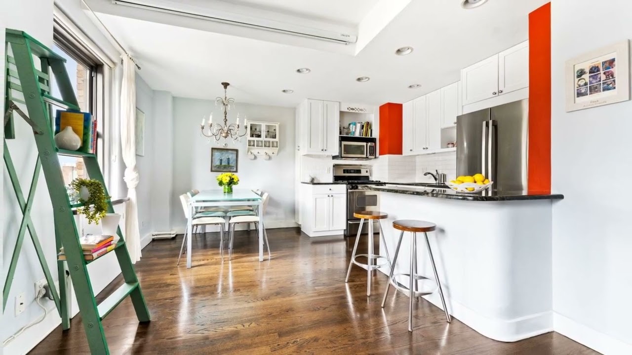 Inside this bright and airy residence, discover refinished hardwood floors, tall beamed ceilings, and sunny southern and western views that skim across the neighboring rooftops. A gracious entry gallery opens to the spacious open-plan living and dining area. Enjoy an open chef’s kitchen featuring abundant cabinet space, granite counters, a breakfast bar and subway tile backsplashes. The stainless steel appliances include a gas range, French door refrigerator, dishwasher and built-in microwave. A utility closet and full guest bathroom add convenience to living spaces.