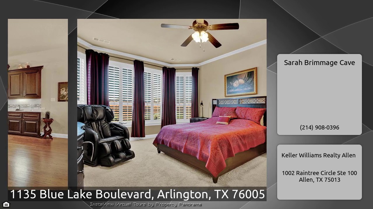 The Virtual Tour for the property at 1135 Blue Lake Boulevard, Arlington, TX 76005 listed for $435,000: Other homes for sale by Sarah Brimmage Cave of Keller Williams Realty Allen: Immaculate single story home in the Viridian addition of Arlington! This 4 bed, bath home features spacious open floor plan, hardwood floors throughout common areas, custom plantation shutters, formal dining room, granite in all bathrooms, and study with French door entry! Chefs kitchen with granite counters, large island, stainless appliances, double oven, and cabinet under lighting! Large split Master en-suite …