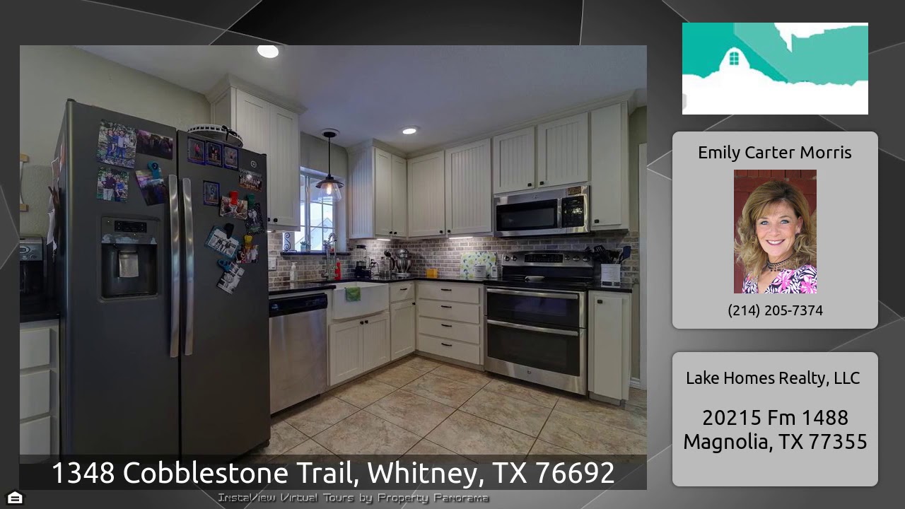 The Virtual Tour for the property at 1348 Cobblestone Trail, Whitney, TX 76692 listed for $285,000: Other homes for sale by Emily Carter Morris of Lake Homes Realty, LLC: Amazing find in White Bluff Resort. Come enjoy the openness of this home with vaulted ceilings, canned lighting, ceramic tile and hard wood floors. Great for entertaining or just relaxing. Master is charming with an on suite. Claw foot tub and huge walk in shower. Sinks are stylish yet simple. Kitchen has a large island, farm house sink, granite counters and lighter cabinets. French doors off the dining room lead to to an …