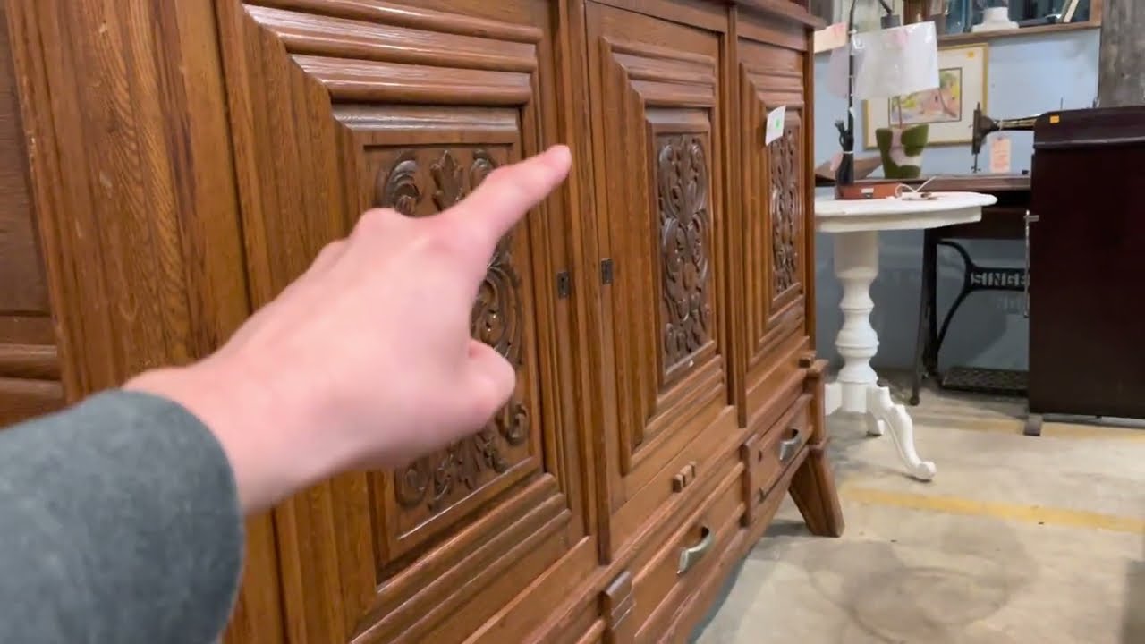 These dining room furniture pieces are so exuberant and lively, with stylish angled legs, beautiful woodgrain, and fantastic carved panels. Other unique features include parquetry inlay on the interior shelves, hidden table leaf supports, a beautiful set of keys, and more!