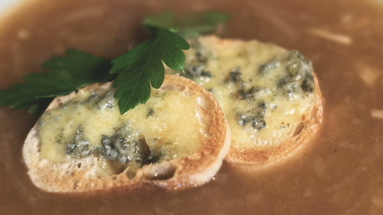 5. While the soup is cooking make the croutons. Preheat the grill. Slice the ciabatta into 1cm slices and place on the grill tray. Sprinkle over the Cashel Blue and place the tray under the grill until the cheese has melted.