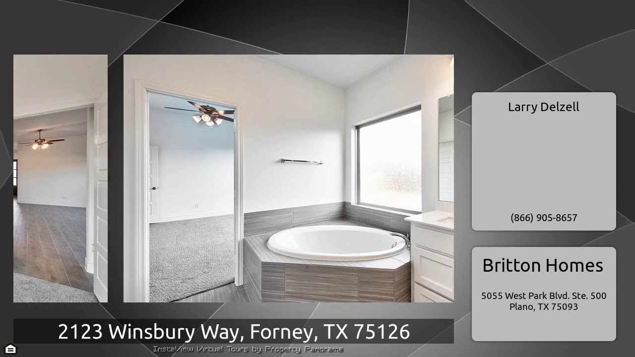 The Virtual Tour for the property at 2123 Winsbury Way, Forney, TX 75126 listed for $236,900: Other homes for sale by Larry Delzell of Britton Homes: PERRY HOMES NEW CONSTRUCTION READY FOR MOVE-IN! Mahogany front door. A welcoming three bedroom house features a Library with French doors set at the entry. Open family room with ceramic tile floor and the option of a fireplace. Spacious kitchen with an island that has built-in seating space that flows into the dining area. Large master bedroom with three windows. Master bath features two vanities, a deep garden tub, large corner glass-enclosed …