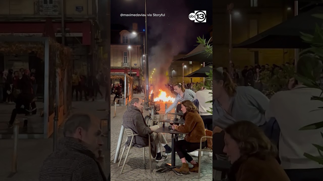 Diners sitting outside at a café in the French city of Bordeaux enjoyed their wine amid the glow of a raging fire lit by demonstrators protesting France’s unpopular pension reform plans.