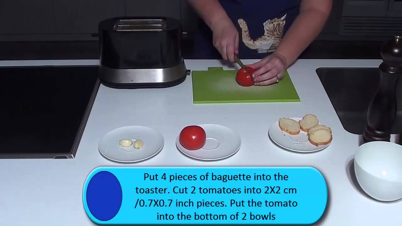 3. Put 4 pieces of baguette into the toaster. Cut 2 tomatoes into 2X2 cm /0.7X0.7 inch pieces. Put the tomato into the bottom of 2 bowls.