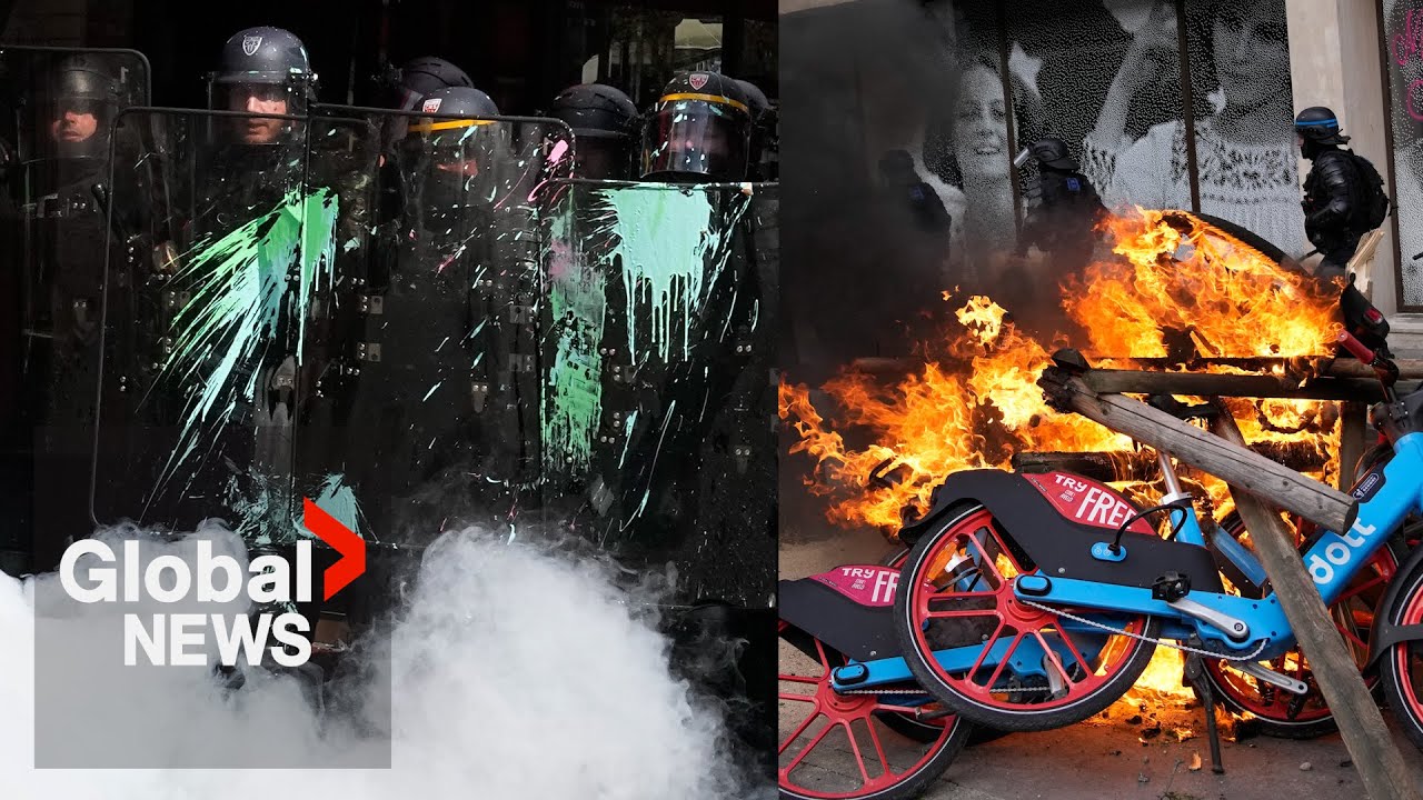 Protesters set fires with bikes, garbage bins and wooden sticks, and even the awning of a restaurant known to be President Emmanuel Macron’s favourite.