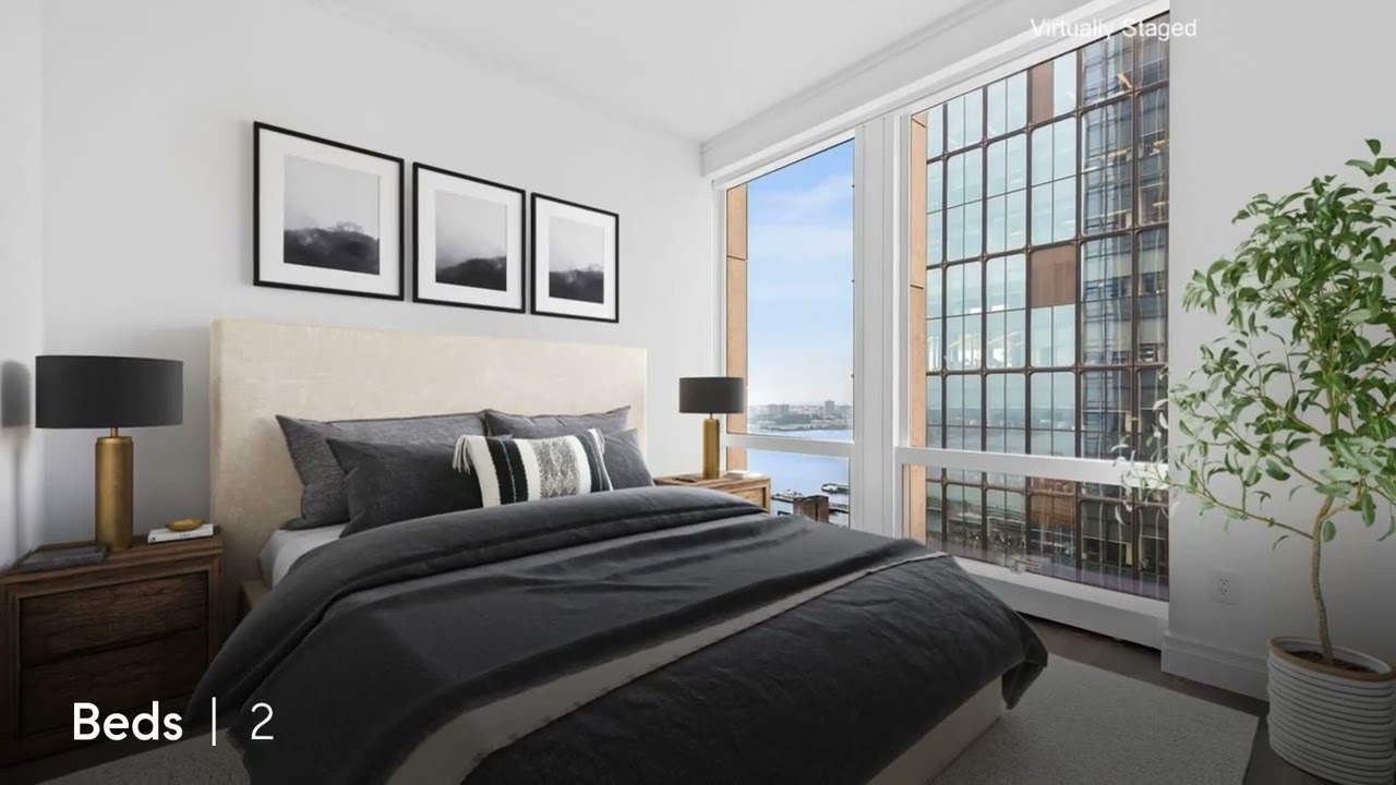 The master bedroom offers water and city views, 2 very large walk-in-closets, and a luxurious, 5-piece, master bathroom which is wrapped in stunning iceberg quartzite, complete with gorgeous double vanity with Kinon panels, separate shower, full depth soaking tub and radiant heated floors to top it off.