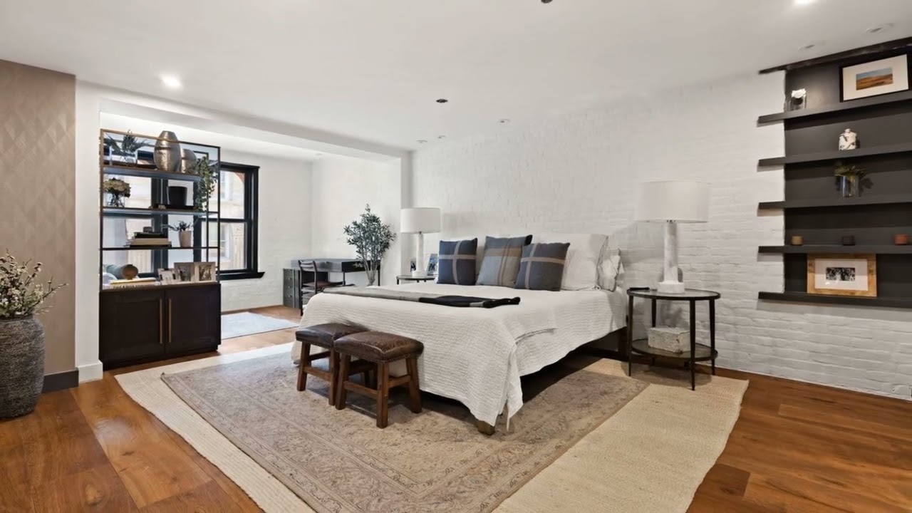 Oversized windows lining the eastern side of the residence fill the enormous 40′ great room with light, providing a perfect backdrop for lounging, dining, and entertaining. The elegant ambience is enhanced by striking original hand-sawn beams, beautiful exposed ceiling joints, antique mirrors, warm exposed brick walls, stunning wide-plank hardwoods, custom recessed floor lights, and a sleek stone fireplace flanked by custom built-ins.