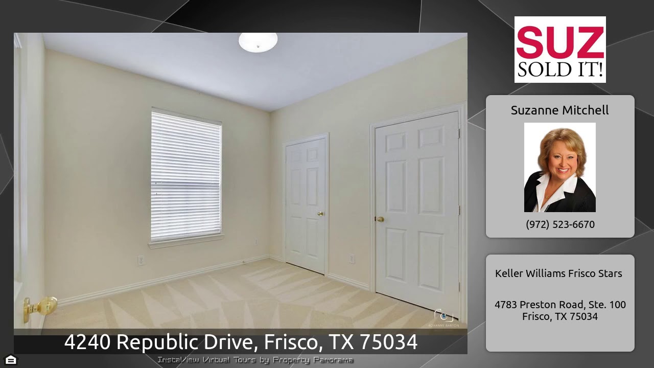 The Virtual Tour for the property at 4240 Republic Drive, Frisco, TX 75034 listed for $319,900: Other homes for sale by Suzanne Mitchell of Keller Williams Frisco Stars: Located in desirable guard gated resort-style community! Character abounds w'rock & brick elevation & columns adorning the covered brick front porch of this 1.5 story home. Soaring ceilings, crown moldings, French doors, plantation shutters & more add to the charm. Formal dining, home office, eat-in island kitchen open to oversized family room w'cast stone fireplace illuminated by walls of windows. The master & two add'l …