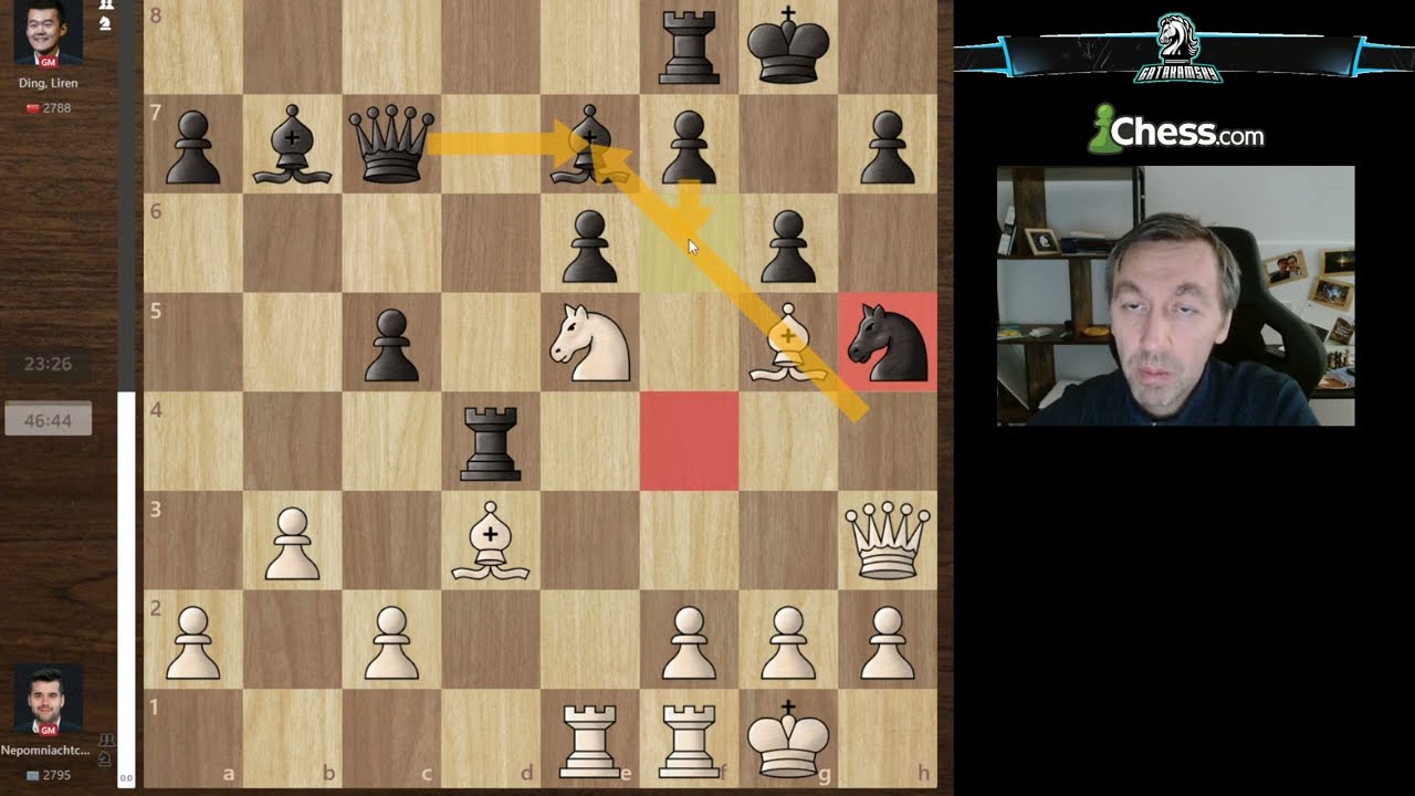 Gata Kamsky “FFL” Chess and Gaming channel. A quick look at the game 7 of the match which has Nepo with White winning again, this time vs Ding’s French Defense. Ultra complicated game with Ding finding great ideas and obtaining an advantage after sacrificing an exchange ! However, he burnt too much time on the clock and blundered in a critical position !