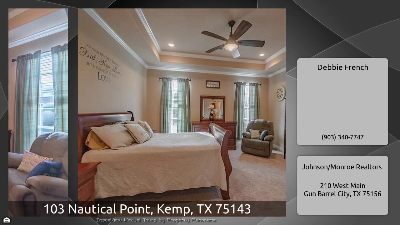 The Virtual Tour for the property at 103 Nautical Point, Kemp, TX 75143 listed for $395,000: Other homes for sale by Debbie French of Johnson/Monroe Realtors: Beautiful one story home with formal dining room and additional detached 2 car garage on over half acre across the street from the water with wonderful views. Located 45 minutes from Downtown Dallas in prestigious gated subdivision. Next to private country club community with social and golf memberships available. Hand scraped wood floors, mud room with built ins, beautiful kitchen. Covered patio and composite deck.