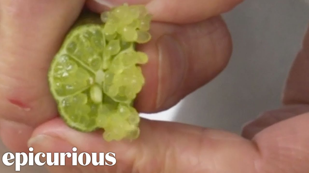 Finger limes! They’re sometimes called caviar limes, and it’s easy to see why—the fruit inside are tiny pearls that look pretty similar.