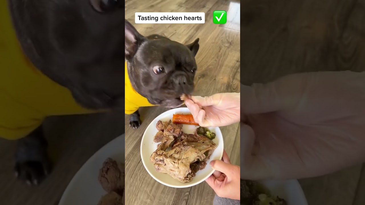 Tasting chicken organs for the first time #dogfood #homemadefood #frenchie