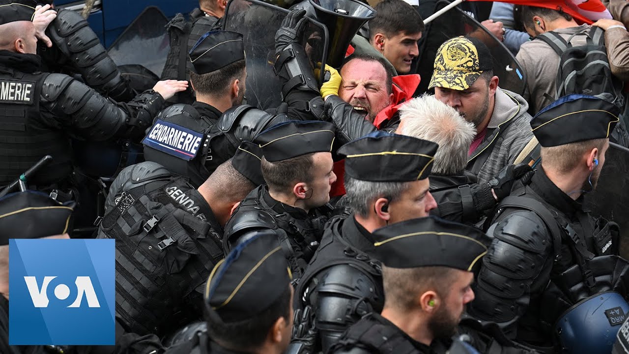 Anti-pension reform protesters are pushed back by police, preventing them from getting close to Chateau de Joux in eastern France, where President Emmanuel Macron is visiting to mark the 175th anniversary of the abolition of slavery in France. (AFP)